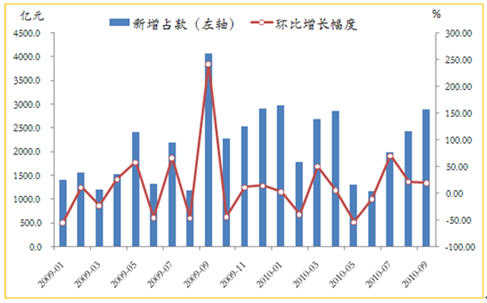 2.回收流動(dòng)性。新增貸款和M2增速均高于預(yù)期,外匯占款創(chuàng)年內(nèi)新高,環(huán)比大幅上升 19.2%。今年前三季度,人民幣貸款共計(jì)新增6.3萬億元,其中,第三季度新增貸款1.6735萬億元,超出標(biāo)準(zhǔn)值1700億元。9月末,M2同比增長(zhǎng) 19%,M1同比增長(zhǎng)20.9%,增速繼續(xù)回落,但仍處歷史高位。同時(shí),觀察9月新增貸款數(shù)據(jù),實(shí)體經(jīng)濟(jì)對(duì)信貸有更多需求,顯示出經(jīng)濟(jì)復(fù)蘇強(qiáng)勁。新增外匯 占款扣除FDI(較穩(wěn)定)和貿(mào)易順差(減少)的差額來看,三季度熱錢流入增多是外匯占款增加的重要原因。前期上調(diào)準(zhǔn)備金率后,金融市場(chǎng)繼續(xù)大漲,可見,并 沒有較好地控制市場(chǎng)流動(dòng)性,這也使得管理層不得已使出加息這一殺手锏。
