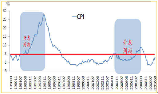 3.8、9月底經(jīng)濟(jì)數(shù)據(jù)繼續(xù)向好,9月CPI或?qū)⒃俅紊蠐P(yáng),通脹預(yù)期增加。此前中國經(jīng) 濟(jì)呈現(xiàn)下滑勢(shì)頭,8月數(shù)據(jù)明顯好轉(zhuǎn),9月數(shù)據(jù)預(yù)計(jì)繼續(xù)向好,這種情況下,政策風(fēng)向由防范經(jīng)濟(jì)增速下滑轉(zhuǎn)向控制通脹。之前我國的負(fù)利率已持續(xù)了十幾個(gè)月,可 以說,加息是情理之中的。近期公布的中央對(duì)"十二五規(guī)劃"的建議中,政府下調(diào)經(jīng)濟(jì)增速目標(biāo)至7%-8%,工作重心轉(zhuǎn)移到加大經(jīng)濟(jì)結(jié)構(gòu)調(diào)整和節(jié)能減排,發(fā)展 新興戰(zhàn)略產(chǎn)業(yè)上來,降低國民經(jīng)濟(jì)對(duì)房地產(chǎn)等行業(yè)的依賴程度。歷次加息的啟動(dòng)在CPI漲幅5%左右。