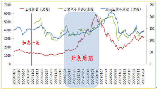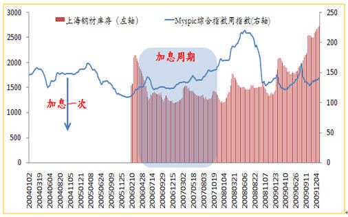 在2004-2007升息周期內(nèi),宏觀經(jīng)濟(jì)穩(wěn)定高速增長(zhǎng),股市稍作休整后,持續(xù)走高, 從998點(diǎn)起步,最高沖到6124點(diǎn),翻了6倍多。加息前期,鋼鐵行業(yè)受制于下游行業(yè)(房地產(chǎn)、汽車等)需求的疲弱,基本維持低位震蕩的走 勢(shì),Myspic指數(shù)在100-150的小區(qū)間運(yùn)行,大宗電子盤熱卷也基本在區(qū)間震蕩。滯后的鋼市終于在06年底07年初的加息后期,開始持續(xù)2年半的上 漲行情。