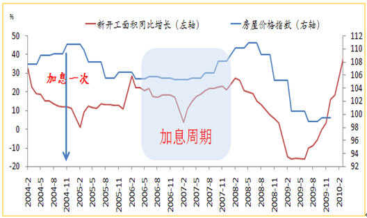3.對(duì)房地產(chǎn)行業(yè)的影響。2004年,國家以前所未有的力度大力整頓土地市場(chǎng),政府政 策圍繞抑制投資過熱和房地產(chǎn)投機(jī),重點(diǎn)集中在土地與金融政策兩個(gè)方面。通過控制房地產(chǎn)供應(yīng)的源頭、規(guī)范房地產(chǎn)市場(chǎng)秩序、通過加息等手段來平衡房地產(chǎn)市場(chǎng)供 求等幾個(gè)方面全方位對(duì)房地產(chǎn)市場(chǎng)進(jìn)行規(guī)范。2004年10至2007年12月升息期間,隨著房地產(chǎn)行業(yè)政策的調(diào)控力度加大,致使新開工面積和房屋價(jià)格指數(shù) 維持低位運(yùn)行。