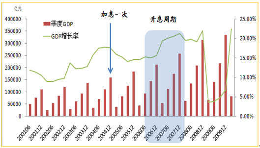 3.8、9月底經(jīng)濟(jì)數(shù)據(jù)繼續(xù)向好,9月CPI或?qū)⒃俅紊蠐P(yáng),通脹預(yù)期增加。此前中國(guó)經(jīng) 濟(jì)呈現(xiàn)下滑勢(shì)頭,8月數(shù)據(jù)明顯好轉(zhuǎn),9月數(shù)據(jù)預(yù)計(jì)繼續(xù)向好,這種情況下,政策風(fēng)向由防范經(jīng)濟(jì)增速下滑轉(zhuǎn)向控制通脹。之前我國(guó)的負(fù)利率已持續(xù)了十幾個(gè)月,可 以說(shuō),加息是情理之中的。近期公布的中央對(duì)"十二五規(guī)劃"的建議中,政府下調(diào)經(jīng)濟(jì)增速目標(biāo)至7%-8%,工作重心轉(zhuǎn)移到加大經(jīng)濟(jì)結(jié)構(gòu)調(diào)整和節(jié)能減排,發(fā)展 新興戰(zhàn)略產(chǎn)業(yè)上來(lái),降低國(guó)民經(jīng)濟(jì)對(duì)房地產(chǎn)等行業(yè)的依賴(lài)程度。歷次加息的啟動(dòng)在CPI漲幅5%左右。